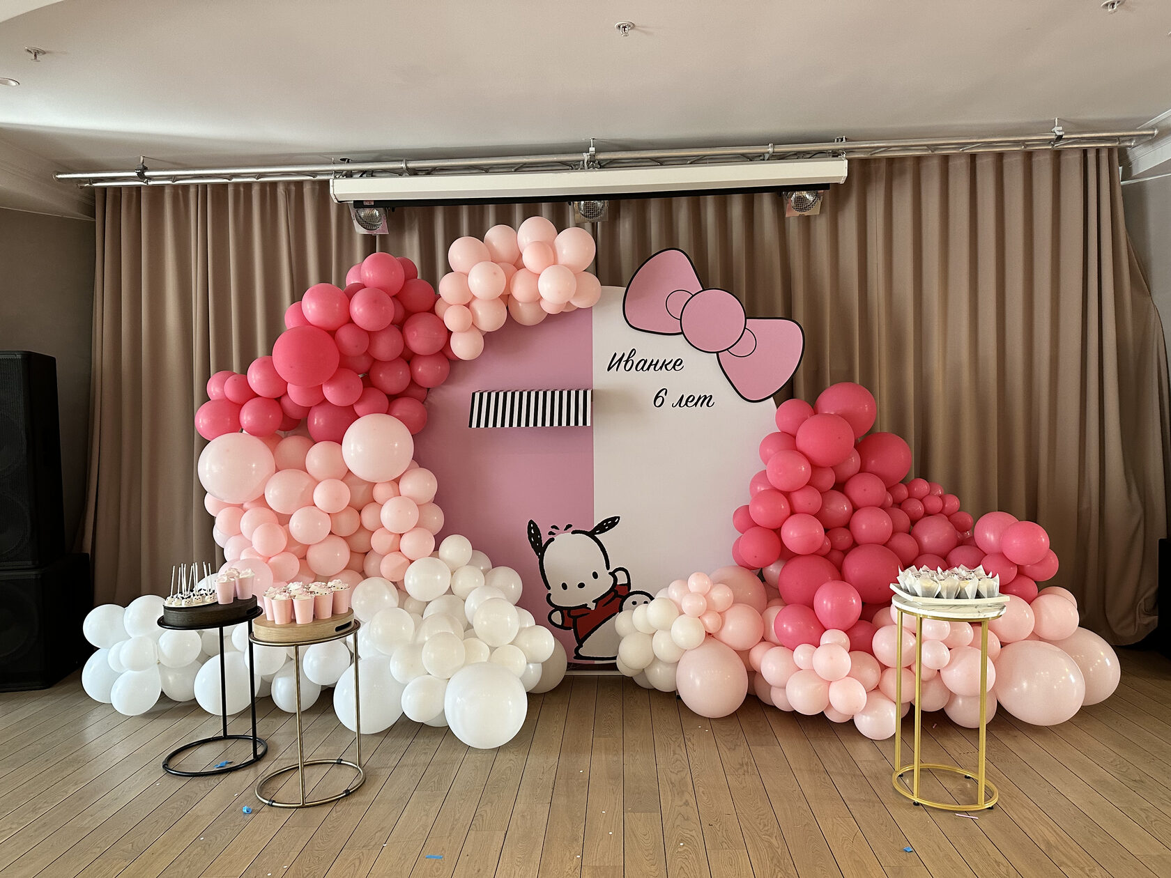 Фотозона из воздушных шаров выполнена на круглом каркасе и дополнительными элементами в виде банта. Конечно, мы сможем сделать фотозону с любым любимым персонажем вашего ребенка и в любой цветовой гамме